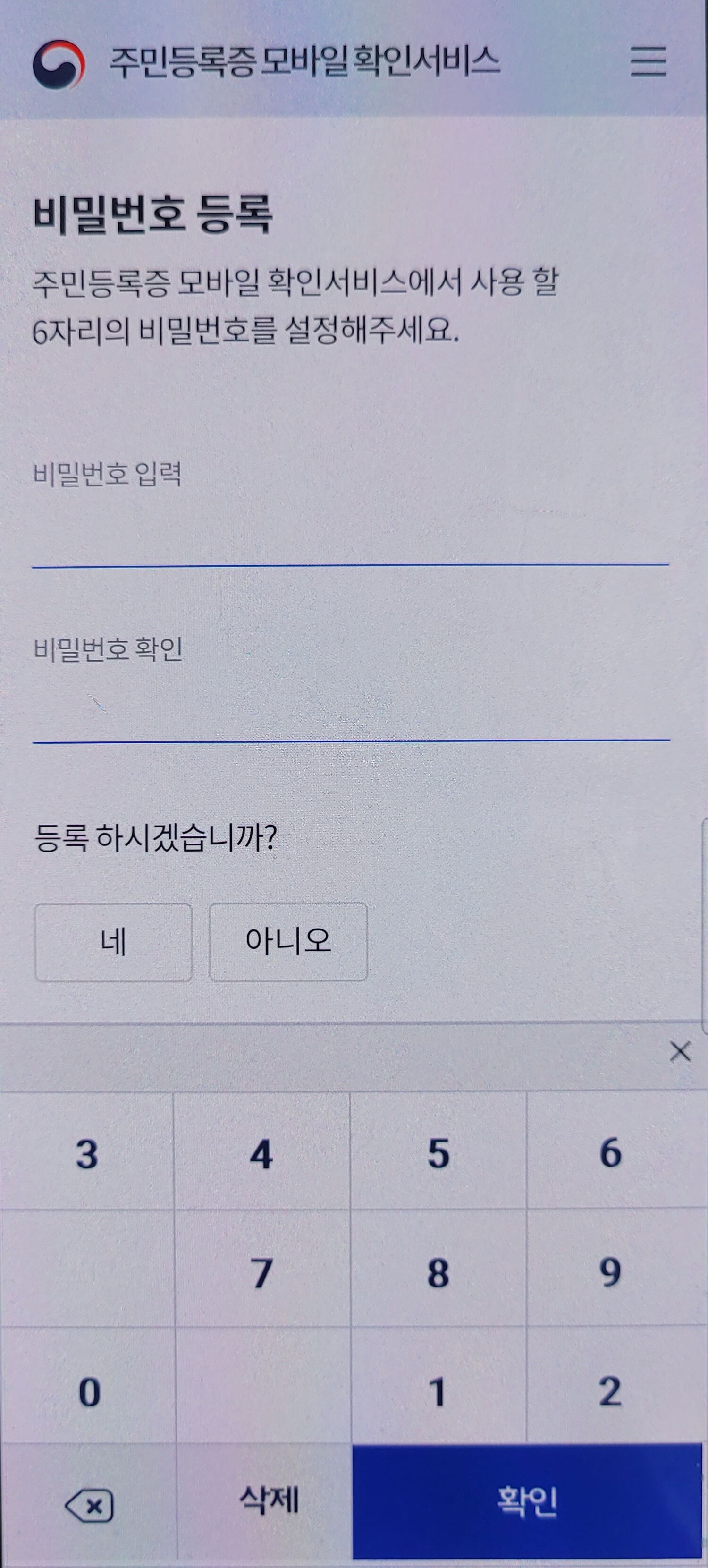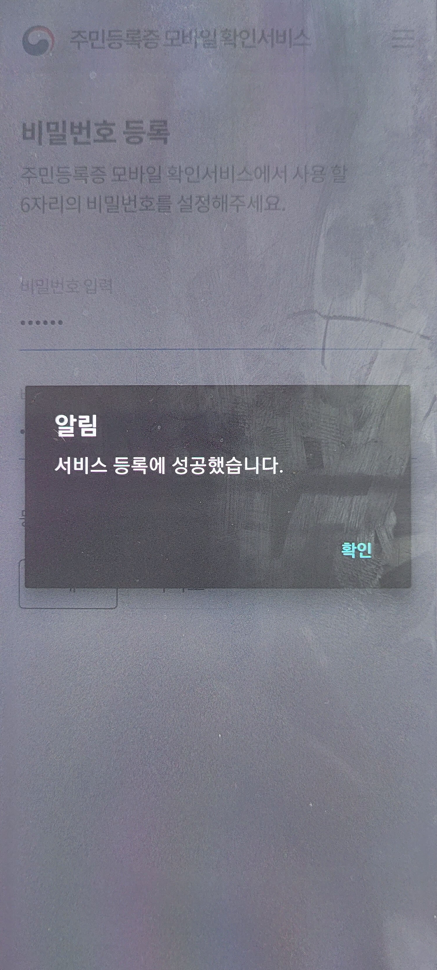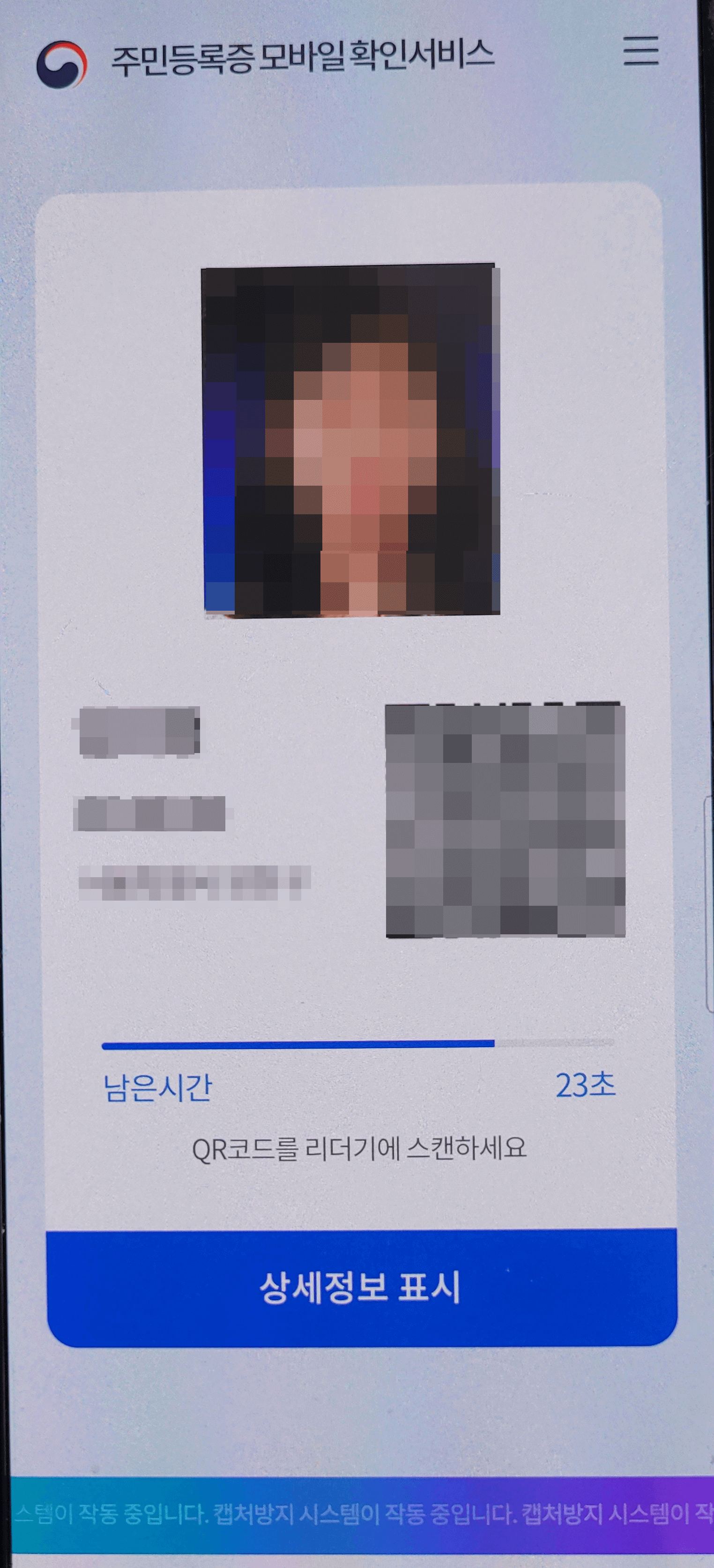 거의 다 왔습니다. 비밀번호 등록해야 하네요. 6자리 입력하시면 됩니다. 서비스 등록에 성공했습니다. 여기까지 하시면 이렇게 QR코드가 생성된 모바일 주민등록증 화면이 뜹니다. 현재 위 화면이 ‘기본 화면’입니다. QR코드와 성명, 생년월일, 그리고 주소는 자치구까지만 나타나네요. ‘상세정보 표시’를 누르시면 주민번호 전체와 상세 주소까지 뜹니다.