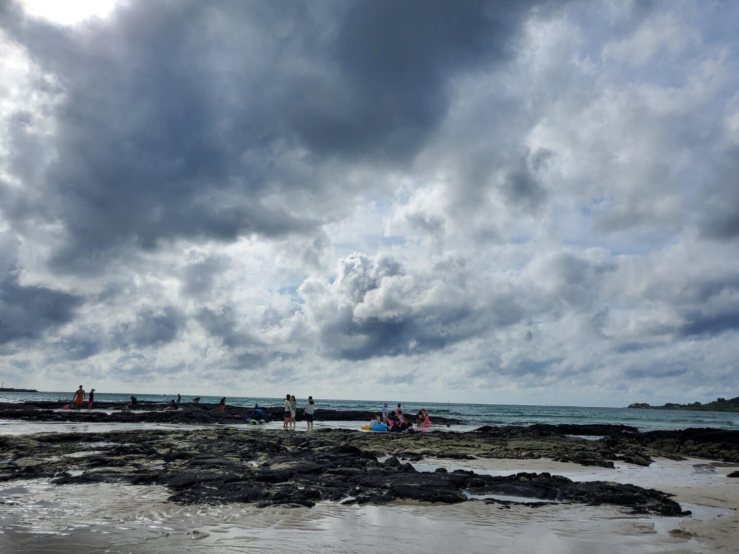 금능해수욕장은 꼭 물때 확인하고 가세요. 이건 꿀팁이라기보다는 기본이에요. 아이랑 같이 가실 경우에는 물이 들어오는 시간보다는 물이 빠지는 시간이 놀기에 훨씬 좋아요. 만일 간조가 오후 1시쯤이라면 오전에 가시면 좋겠지요. 물이 서서히 빠지면서 해수욕장 가장자리에 있는 검은 돌무더기가 드러나요.