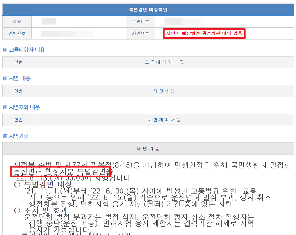 이파인 사이트에서 보시는 것처럼, 경찰이 공식적으로 쓰는 용어도 특별사면이 아닌 '운전면허 행정처분 특별감면'입니다. 2022년 8.15 광복절 특사에서는 음주운전 1회 이상, 사망사고, 무면허 운전 등은 특별감면 대상에서 제외한다고 안내되어 있습니다.